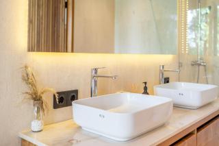 Diese Villa mit Klimaanlage besteht aus 3 Schlafzimmern, einem Wohnzimmer, einer voll ausgestatteten Küche mit einem Kühlschrank und einer Kaffeemaschine sowie 3 Badezimmern mit einem Bidet und einer Dusche. In dieser Villa werden Handtücher und Bettwäsche angeboten.